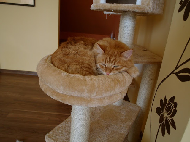 A teraz to o czym zamierzałam napisać. Wczoraj przyszła do nas paczka, a nawet dwie. Nie, nikt nam niespodzianki nie zrobił :), paczka przyszła z Zooplusa. Jedna wagi 29 kg druga prawie 31 kg. Najpierw był problem bo gabaryty ich były ogromne i trzeba było rozebrać samochód na części żeby się zmieściły. Dla jasności, samochód mój bo paczki kurier dostarcza mi do pracy. Potem musiałam te paki wytaszczyć z samochodu do windy i do domu. Niestety sąsiad napatoczył się dopiero jak drugą paczkę wciągałam do mieszkania. Jedna paczka to troszkę jedzenia i sam żwir :). Wiadomo żwiru u mnie idzie. Jeśli zaś chodzi o jedzonko przyszły puszki FineFood już po raz kolejny i mogę je z czystym sumieniem polecić. Koty się zajadają, oprócz Bajki rzecz jasna. "Tadek-niejadek" żyje jedynie na Felixach. Bajka zawsze kiepsko jadła, ale odkąd dostała Felixa to zaczęłą mieć apetyt. Jednak każda próba karmienia jej czymś innym sprawia, że potrafi i dwa dni nie ruszyć mokrego. Tyle o paczce pierwszej. Drugie pudło zawierało za to coś, co miałam nadzieję sprawi radochę moim futrzakom. Otóż w drugiej paczce był ..... drapak!! Nie jakiś tam drapaczek, tylko drapakowy kompleks- domek z piernika. Dopiero w trakcie składania zdałam sobie sprawę, że potrzebuję sporo miejsca aby go ustawić. Sprawdziłam trzy lokalizacje i udało się. Podczas składania towarzyszyła mi Bajka-konsultantka. W trakcie skręcania wyostrzyła pazurki na każdym elemencie, obejrzała każdą śrubkę....najwyraźniej uznała, że akurat ten drapak jest dla niej :) i po złożeniu przeszła do dalszej części inspekcji.